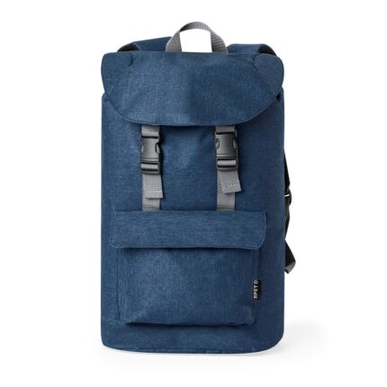 Mochila confeccionada en elegante polipiel. De diseño urbano que incluye un bolsillo central acolchado con doble cierre para tablet de hasta 10 pulgadas y portátil de hasta 15 pulgadas, así como un bolsillo segundario. Además, tiene un bolsillo frontal con cremallera y solapa protectora. Las cintas de hombros y la espalda son acolchadas, ajustables y cuentan con una tela transpirable. Incorpora un accesorio para ajustarse al trolley y una cómoda asa en la parte superior. Presentada en una bolsa individual reciclada.