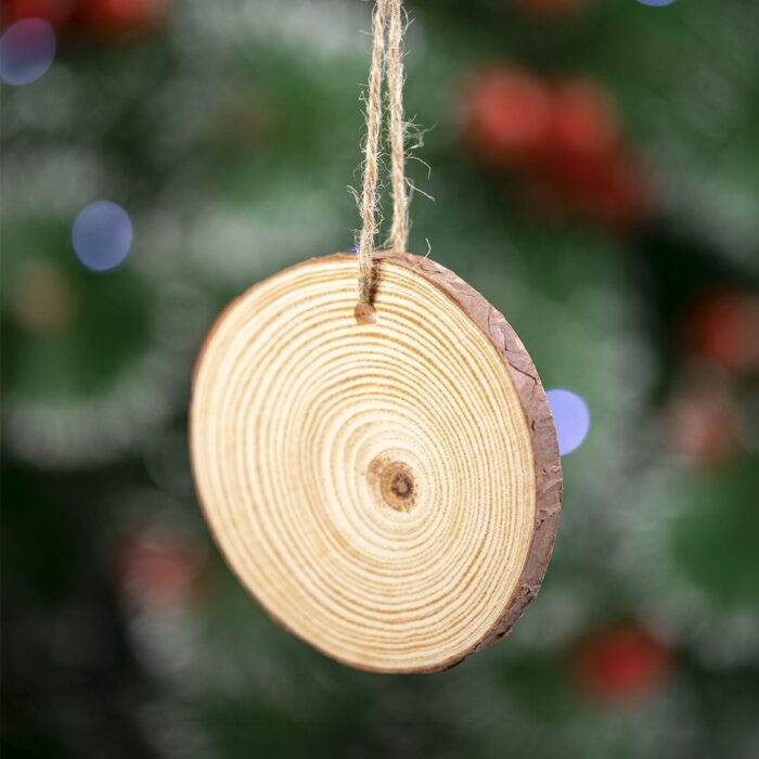Adorno navideño en madera natural al corte, con lacito para colgar y bola a juego. Ideal para marcaje en láser.