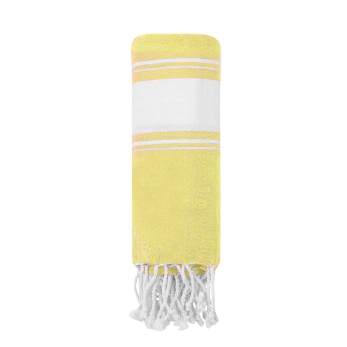 Suave pareo de toalla de 180g/m2 en combinación de algodón y poliéster. Disponible en variada gama de colores en tono bicolor. Presentado individualmente en bolsa.