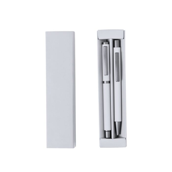 Elegante set de bolígrafo y roller. Bolígrafo de mecanismo pulsador y roller con capucha, ambos con clip metálico, carga jumbo y de tinta azul. Cuerpo en variados colores sólidos acabado goma y detalles metálicos en gris oscuro. Presentados en una caja de variados colores a juego con compartimentos interioriores separados.