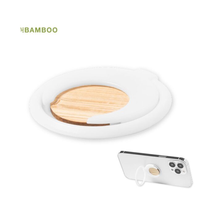 Soporte multifunción para smartphone, con moneda para carro de la compra integrada y anilla/soporte plegable. Cuerpo fabricado en resistente ABS de acabado blanco, con moneda en bambú. Con adhesivo de fijación extra fuerte y libre de residuos al despegarlo del dispositivo.