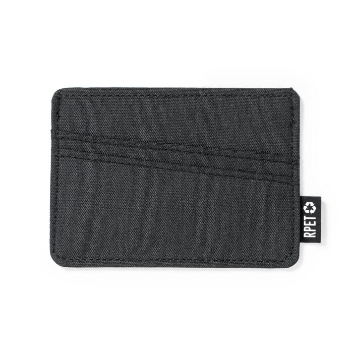Elegante tarjetero fabricado en poliéster RPET 300D. Con 3 compartimentos independientes para tarjetas y distintivo RPET en la etiqueta exterior. El material RPET se elabora a partir de plástico reciclado, para así fomentar la reutilización de residuos plásticos y ayudar a la sostenibilidad del planeta.