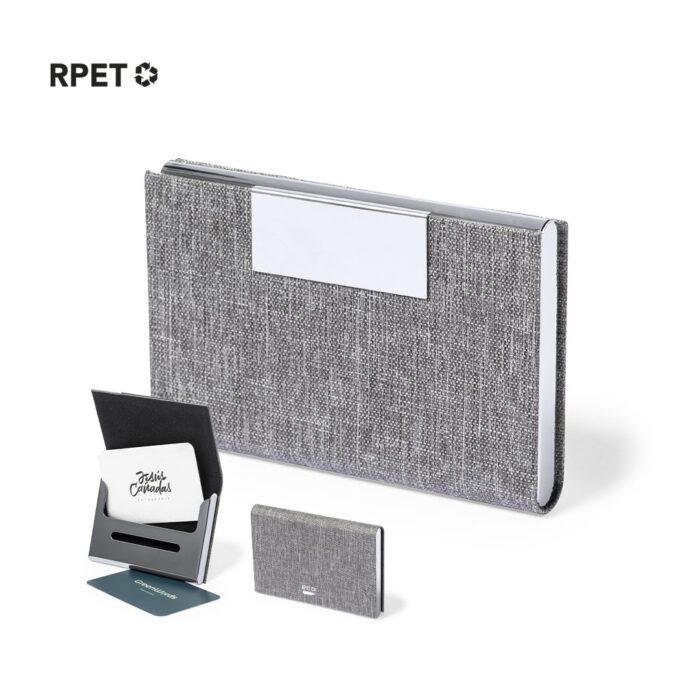 Elegante tarjetero fabricado en resistente poliéster RPET 300D. De tapas duras y cierre magnético. Con detalle metálico cromado en la parte frontal y compartimento interior para almacenar las tarjetas. Con distintivo RPET en la parte trasera y disponible en variada gama de colores. El material RPET se elabora a partir de plástico reciclado, para así fomentar la reutilización de residuos plásticos y ayudar a la sostenibilidad del planeta.