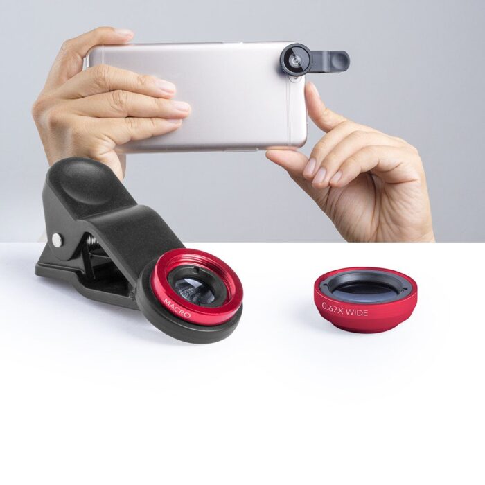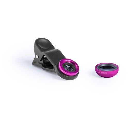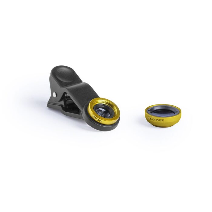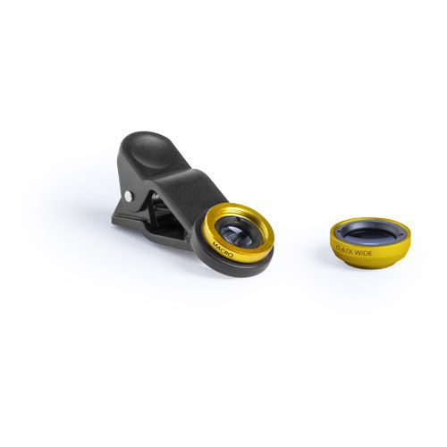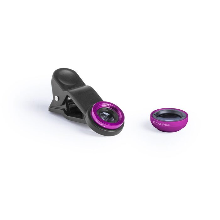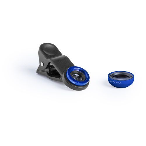 Set de lentes universales para smartphone, ajustables a la cámara mediante pinza. Lentes de aluminio y cristal, con efectos -macro- y -gran angular-, con paño limpiador de microfibra y presentadas en una bolsita de terciopelo con cordones autocierre. Set presentado en atractiva caja de diseño.