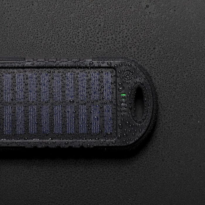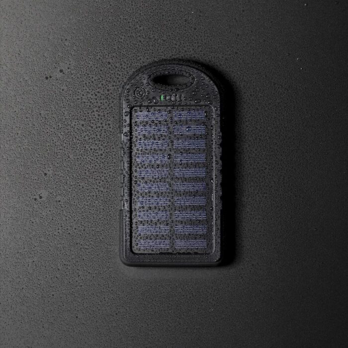 Resistente batería auxiliar externa de recarga solar, resistente a las salpicaduras de agua y de gran capacidad de carga -4.000 mAh-. Con recubrimiento de silicona y de corte deportivo, está especialmente diseñada para actividades al aire libre en las que no hay posibilidad de acceso a una fuente de recarga eléctrica. Dispone de salida USB dual para cargar dos dispositivos simultáneamente, LED indicadores de estado de carga y potente luz LED de señalización SOS, Diseñado para usar en caso de situaciones de emergencia. Con mosquetón de transporte de aluminio y resistente cable micro USB incluido. Disponible en extensa gama de colores Presentada en atractiva caja de diseño. Las capacidades mostradas en todas nuestras baterías auxiliares externas son reales, incorporando todas ellas baterías de grado A y no recicladas, con una vida útil de al menos 500 ciclos de carga y según normativa CE. Además, están fabricadas conforme a los estándares RoHS y en cumplimiento con los siguientes requisitos de seguridad: Sistema de protección contra sobrecarga del power bank. Sistema de protección contra descarga completa que proporciona una mayor durabilidad del power bank. Sistema de bloqueo para evitar cortocircuitos. Sistema de transferencia de carga constante, acorde con la capacidad del dispositivo de destino.