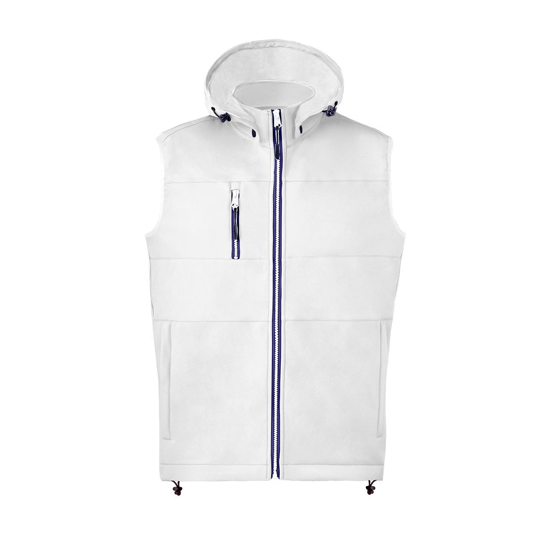 Chaleco de resistente y transpirable material soft shell de 300g/m2. De corte moderno, con cremallera central, bolsillos laterales y práctico bolsillo en pecho con cierres de cremallera y tiradores en contraste. Cuello elevado con capucha ajustable y desmontable. Dobladillo inferior con cordón ajustable. Exterior en soft shell resistente al viento y al agua, e interior de cálido micropolar en color contraste. Disponible en tallas XS, S, M, L, XL, XXL.
