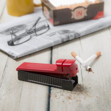 Inyectora para tabaco en diseño bicolor y variada gama de colores. Con pulsador de entubado y presentada en caja individual de diseño.