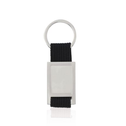 Llavero de divertido diseño con cinta de poliéster de variados y vivos colores. Con cuerpo metálico troquelado especialmente diseñado para marcaje en doming/gota de resina.
