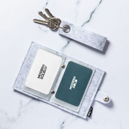 Elegante tarjetero fabricado en fieltro RPET. Compartimento principal con cierre de corchete metálico y 6 compartimentos independientes. Con distintivo fieltro RPET en la etiqueta exterior. El fieltro RPET es fruto de la combinación del proceso de reciclaje de materiales plásticos junto con la técnica milenaria de fabricación del fieltro, dando como resultado un material de eco-tendencia que, además de ser de origen reciclado, también se convierte en reciclable.