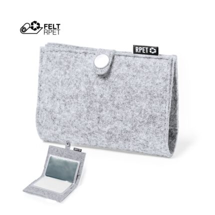 Elegante tarjetero fabricado en fieltro RPET. Compartimento principal con cierre de corchete metálico y 6 compartimentos independientes. Con distintivo fieltro RPET en la etiqueta exterior. El fieltro RPET es fruto de la combinación del proceso de reciclaje de materiales plásticos junto con la técnica milenaria de fabricación del fieltro, dando como resultado un material de eco-tendencia que, además de ser de origen reciclado, también se convierte en reciclable.