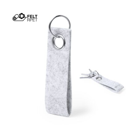 Elegante llavero con cinta fabricada en fieltro RPET y ojal metálico cromado. Con distintivo fieltro RPET en la cinta y anilla metálica cromada. El fieltro RPET es fruto de la combinación del proceso de reciclaje de materiales plásticos junto con la técnica milenaria de fabricación del fieltro, dando como resultado un material de eco-tendencia que, además de ser de origen reciclado, también se convierte en reciclable.