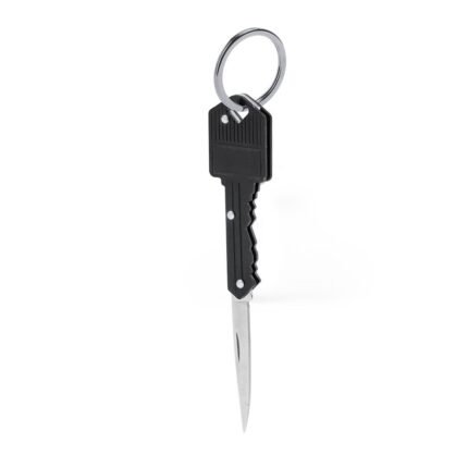 Práctico llavero abridor metálico. Con anilla para llavero y mosquetón para un rápido enganche. Con abrebotellas en uno de sus extremos, incorpora un pequeño cuchillo de acero inox en el extremo opuesto, ideal para abrir cartas, paquetes, etc. En elegante color negro metalizado y presentado en bolsa de papel reciclada.