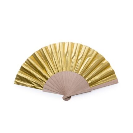 Abanico de varillas de madera natural y tela en poliéster de acabado brillo. Disponible en colores dorado y plateado. Presentado en caja individual.