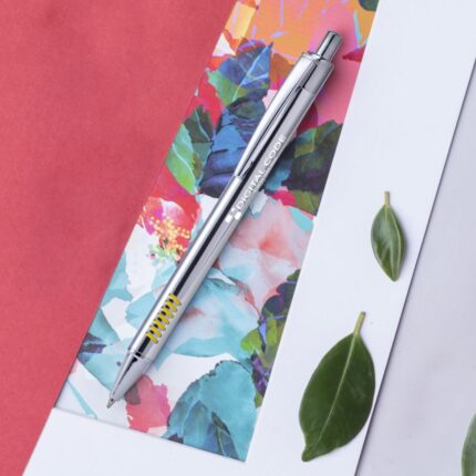 Bolígrafo de acabado cromado con cuerpo en aluminio y original empuñadura en variada gama de colores. De mecanismo pulsador, con cartucho jumbo y tinta azul.