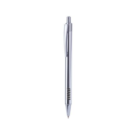 Bolígrafo de acabado cromado con cuerpo en aluminio y original empuñadura en variada gama de colores. De mecanismo pulsador, con cartucho jumbo y tinta azul.