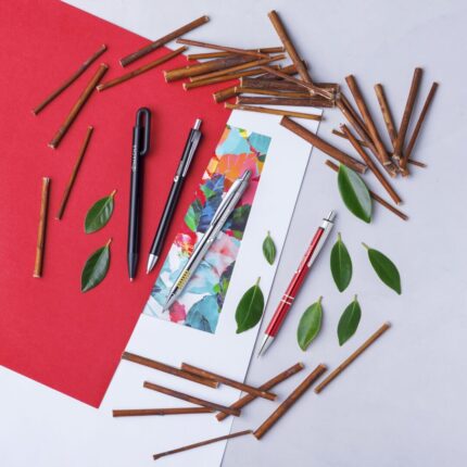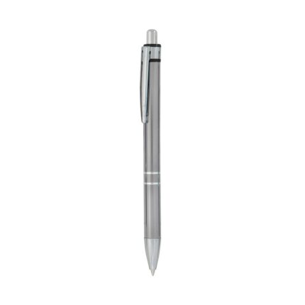 Bolígrafo de mecanismo pulsador en original diseño bicolor. Con cuerpo en aluminio de suave acabado en alegres colores. Accesorios y anillas en plateado. Clip de original diseño y tinta azul.