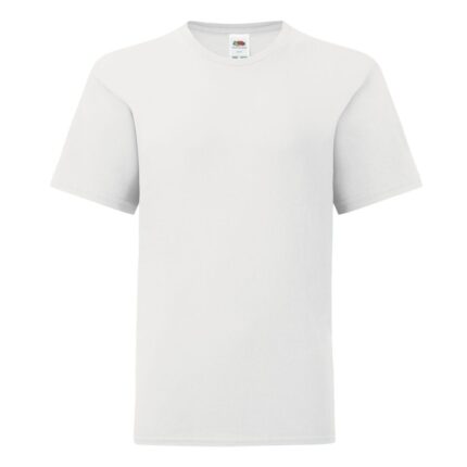 Camiseta para niño blanca Iconic de Fruit Of The Loom. Fabricada en material 100% algodón peinado Ring Spun de 140g/m2. De tacto suave y corte clásico, con cuello redondo estrecho de canalé 1x1 y tapeta a juego. Etiqueta fácilmente removible y disponible en tallas 3-4, 5-6, 7-8, 9-11, 12-13, 14-15.